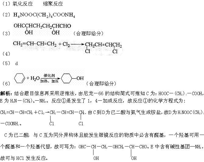 尼龙-66广泛用于制造机械、汽车、化学与电气装置的零件,亦可制成薄膜用作包装材料,其合成路线如下图所示(中间产物E给出两条合成路线)。