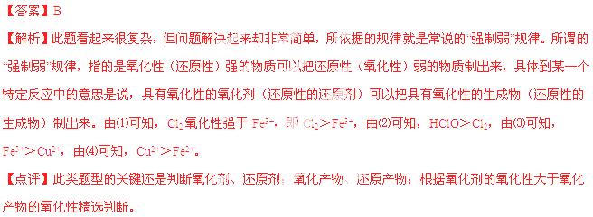 C.Cl2>HClO>Fe3+>Cu2+>Fe2+ D.HClO>Fe3+>Cl