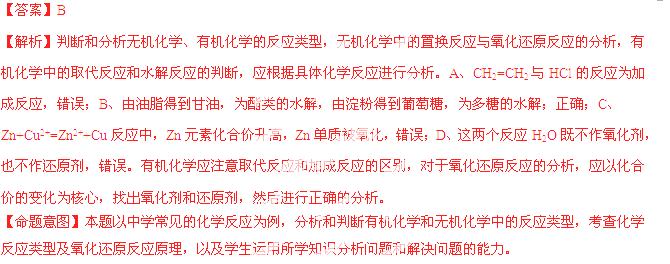 | B | 由油脂得到甘油 由淀粉得到葡萄糖 | 均发生了水解反应 |