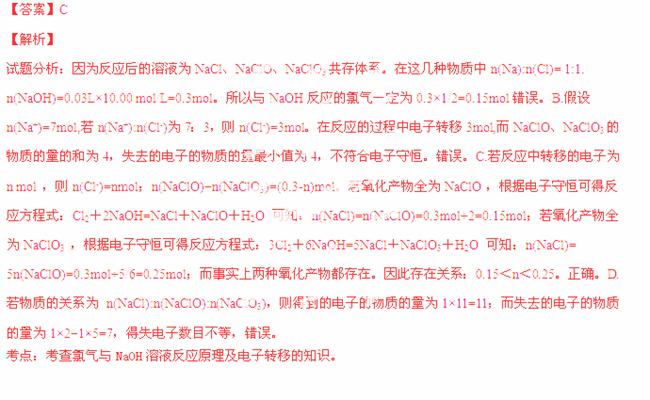 将一定量的氯气通入30mL浓度为10.00 mol·L-1的NaOH浓溶液中,加热少许时间后溶液中形成NaCl、NaClO、NaClO3共存体系。下列判断正确的是