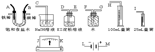 请从下图中选出必要的装置进行电解饱和食盐水的实验,要求测定产生的H2的体积(大于25 mL),并检验Cl2的氧化性。