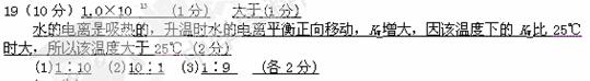 (10分)某温度(T℃)时,测得0.01 mol/L NaOH溶液的pH为11,则该温度下水的KW=________。则该温度________ (填“大于”、“小于”或“等于”)25℃,其理由是_________________________________________ 。