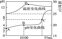 将1.00 mol·L-1 NaOH溶液滴入20.00 mL 1.00 mol·L-1的一元酸HA溶液中,测得混合溶液的pH和温度随加入NaOH溶液体积变化曲线如图所示。