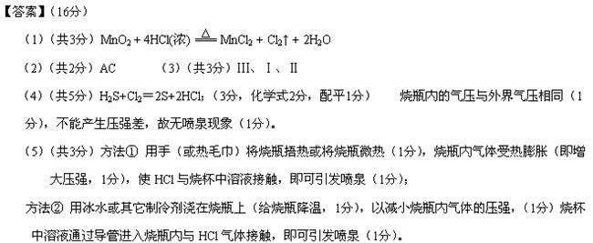 (4)打开K1、K2,将常温压下的H2S、Cl2以体积比1:1充满烧瓶后,烧瓶中发生的反应用化学方程式表示为 ;关闭K1、K2,始终看不到烧瓶内产生“喷泉”现象,理由是: 。