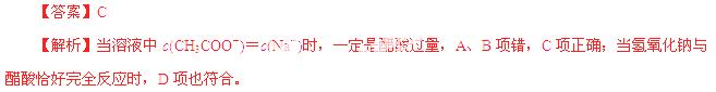 B.当溶液中c(CH3COO-)=c(Na+)时,一定是氢氧化钠过量