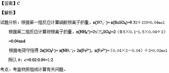 已知某亚铁盐的化学式可表示为(NH4)a Feb(S04)c。取一定质量的该亚铁盐样品全部溶于足量的水中,将所得溶液平均分为两份。一份溶液中加入足量的BaCl2溶液,得到白色沉淀9.32 g。另一份溶液同足量的浓NaOH溶液共热,产生的氨气用100 mL 0.5mo1·L-1稀硫酸吸收后(设产生的氨全部逸出),剩余的硫酸再用1.5 mol·L-1NaOH溶液中和,需NaOH溶液40mL。该亚铁盐样品中b:c的比值为