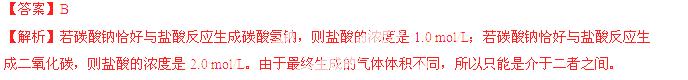 120 mL含有0.20 mol碳酸钠的溶液和200 mL盐酸,不管将前者滴加入后者,还是将后者滴加入前者,都有气体产生,但最终生成的气体体积不同,则盐酸的浓度合理的是