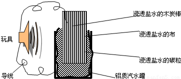 【答案】分析:碳棒、铝罐和食盐水构成了原电池,较活泼的金属铝作负极,导电的非金属碳棒作正极,负极上铝失电子发生氧化反应,正极上得电子发生还原反应;原电池放电时,正极应与玩具电机的正极相连.