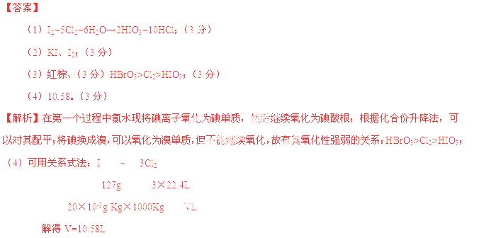 (4)加碘盐中含碘量为20mg~50mg/kg。制取加碘盐(含KIO3的食盐)1000kg,若庄KI与Cl2反应制KIO3,至少需要消耗Cl2 L(标准状况,保留2位小数)。
