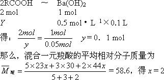 答案:HCOOH CH3COOH CH3CH2CH2COOH或 解析:三种不同的羧酸,均不知具体的相对分子质量,唯一明显的线索是混合羧酸与Ba(OH)2间的定量反应,最终要推算出三种羧酸各为什么,初看起来,似乎无处下手.但只要冥心静思,便可发现许多线索或突破口:由中和反应的实质知n(-COOH)=n(OH-),即为5.86 g混合一元羧酸的总的物质的量;在此基础上,可挖掘出一个关键量M;再根据3种羧酸的相对分子质量之比和混合羧酸的组成配比,得A的相对分子质量为23x,则B、C的相对分子质量分别为30x和44x,只含一个未知数(x),利用平均相对分子质量,便可列式求解. 设A的相对分子质量为23x,则B、C的相对分子质量分别为30x和44x,与Ba(OH)2反应的混合羧酸的平均分子式为R-COOH,反应的羧基(-COOH)的物质的量之和为y,则 故A的相对分子质量为46,由CnH2nO2知式中n=1,A为HCOOH;B的相对分子质量为60,由CnH2nO2,得n=2,结构简式为CH3COOH,且能发生银镜反应的B的同分异构体的结构式为HCOOCH3;又C的相对分子质量为88,由CnH2nO2得n=4,结构简式可能为CH3CH2CH2COOH或 |