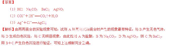 在四个脱落标签的试剂瓶中,分别盛有盐酸、BaCl2溶液、Na2CO3溶液、AgNO3溶液,为了鉴别各瓶中的试剂将它们分别编号为A、B、C、D并两两混合,其实验现象为:A+B产生无色气体;B+C产生白色沉淀;A+D产生白色沉淀;A+C无明显变化。