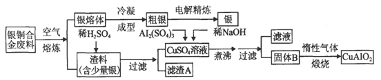 银铜合金广泛用于航空工业。从切割废料中回收银并制备铜化工产品的工艺如下图:![]()