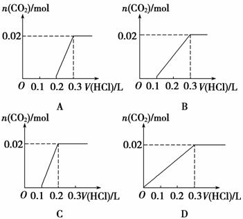 将0.84 g NaHCO3和1.06 g Na2CO3混合并配成溶液,向溶液中滴加0.1 mol·L-1稀盐酸。下列图像能正确表示加入盐酸的体积和生成CO2的物质的量的关系的是