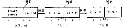 N(g)+P(g)分别在密闭容器的两个反应室中进行,反应室之间有无摩擦、可滑动的密封隔板。反应开始和达到平衡状态时有关物理量的变化如图所示:![]()