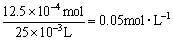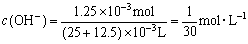 解:当沉淀不再增加时,已发生的离子反应为Ba2++2OH-+2H++SO42-══BaSO4↓+2H2O,其中OH-与H+反应的物质的量之比为1∶1,也即这时溶液中OH-反应了一半,剩余的OH-物质的量为原来的一半,溶液仍为碱性,因此要计算溶液的pH,应先求此时溶液中OH-的浓度,由此再求H+的浓度而求得pH。要求OH-浓度还应该注意到加入H2SO4后,溶液的总体积要增大,等于原溶液体积加上加入H2SO4溶液的体积。 (2)从(1)的计算中可求得Ba(OH)2物质的量进而求其浓度,同理可得NaOH物质的量,进而求得其浓度。 (1)pH=13,则混合液中c(OH)=1´10-1mol×L-1 H2SO4中c(H+)=0.05mol×L-1´2=0.1mol×L-1 因此滴定至终点消耗硫酸的体积等于混合液体积为25mL。 则沉淀不再增加时消耗 此时消耗OH-的物质的量为0.1mol×L-1´12.5´10-3L=1.25´10-3mol 剩余OH-物质的量为0.1mol×L-1´25´10-3L-1.25´10-3mol=1.25´10-3mol 此时溶液中 pH=1gc(H+)=-1g30´10-14=12.48 (2)Ba2++2OH-+2H++SO42-══BaSO4↓+2H2O n[Ba(OH)2]=n(H2SO4)=0.05mol×L-1´12.5´10-3L=5´12.5´10-5mol c[Ba(OH) n(NaOH)=0.1mol×L-1´12.5´10-3L=12.5´10-4mol c(NaOH)=