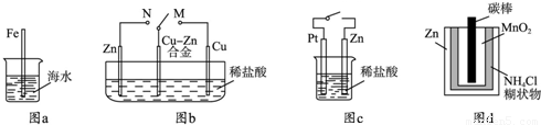 | A、图a中.插人海水中的铁棒,越靠近底端腐蚀越严重 | B、图c中,接通开关时,Zn腐蚀速率增大,Zn上放出气体的速率也增大 | C、图b中,开关由M改置于N时,Cu-Zn合金的腐蚀速率减小 | D、图d中,Zn-MnO2干电池自放电腐蚀主要是由MnO2的氧化作用引起的 |