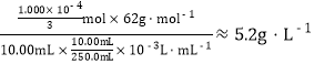 (2)与K2Cr2O7反应的n(Fe2+)=6n(K2Cr2O7)=6×0.0200mol·L-1×20.00mL×10-3L·mL-1=2.400×10-3mol,与NO3-反应的n(Fe2+)=0.1000 mol·L-1×25.00mL×10-3L·mL-1-2.400×10-3mol=1.000×10-4mol,则原溶液中m(NO3-)=1.000×10-4mol×62g·mol-1×250mL/(3×10mL),根据流程液态产品的体积为10.00×10-3L,即NO3-的含量为5.2g·L-1;