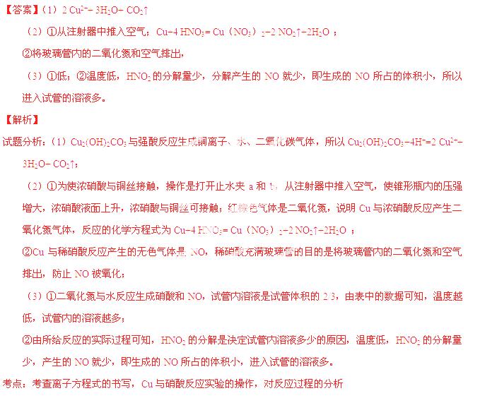 ② 查阅材料:a.NO2与水反应的实际过程为:2NO2+ H2O=HNO3+ HNO2,3 HNO2= HNO3+2NO↑+H2O;b. HNO2不稳定。则产生上述现象的原因是 。