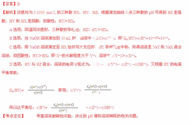 A.在相同温度下,同浓度的三种酸溶液的导电能力顺序:HZ<HY<HX