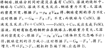 如图所示,等臂杠杆AB两端各挂体积相同、质量相等的空心铜球和铁球,在水平位置平衡,再将铜球、铁球分别同时浸没在盛有CuSO4溶液的烧杯中,则将发现(球体积变化忽略不计)