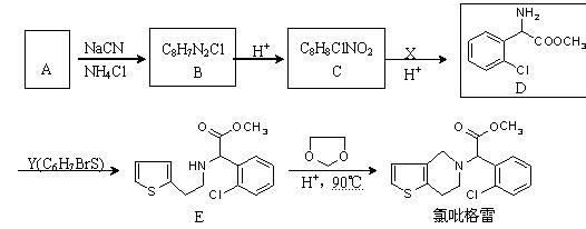 氯吡格雷(clopidogrel)是一种用于抑制血小板聚集的药物。以A(C7H5OCl)为原料合成氯吡格雷的路线如下: