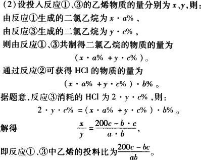 由于副反应的存在,生产中投入的乙烯全部被消耗时,反应①、③中二氯乙烷的产率依次为a%、c%;二氯乙烷全部被消耗时,反应②中氯化氢的产率为b%.试计算:反应①、③中乙烯的投料比为多少时,新工艺既不需要购进氯化氢为原料,又没有副产物氯化氢剩余(假设在发生的副反应中既不生成氯化氢,也不消耗氯化氢).