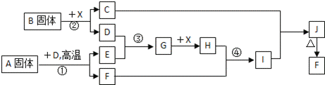 根据下列框图关系填空,已知反应①、③是我国工业生产中的重要反应,X常温下为无色无味透明液体;C焰色反应火焰呈黄色,J为红褐色沉淀;D、E常温下为气体,且E能使品红溶液褪色;A固体中仅含两种元素,其中金属元素的质量分数约为46.7%.