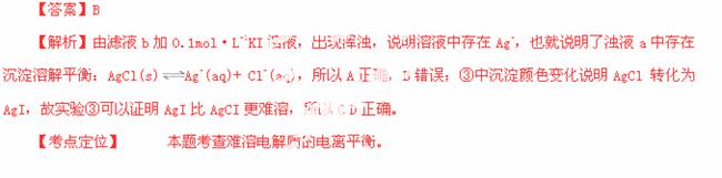 实验:①0.1mol·L-1AgNO3溶液和0.1mol·L-1NaCl溶液等体积混合得到浊液a,过滤得到滤液b和白色沉淀c;② 向滤液b中滴加0.1mol·L-1KI溶液,出现浑浊;③ 向沉淀c中滴加0.1mol·L-1KI溶液,沉淀变为黄色。下列分析不正确的是