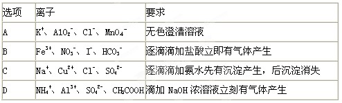 | A | K+、AlO、Cl-、MnO | c(K+)<c(Cl-) |