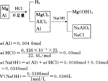 (4)在丙组实验之后,向容器中加入1 mol·L-1的NaOH溶液,能使合金中的铝恰好溶解,不形成铝的沉淀,并使Mg2+刚好沉淀完全,求所加入NaOH溶液的体积(写出计算过程)