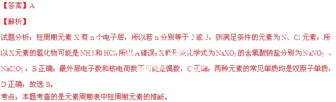 短周期元素X原子核外的电子处于n个电子层上,最外层电子数为(2n+1),核内质子数为(2n2-1)。有关X的说法中不正确的是 ( )