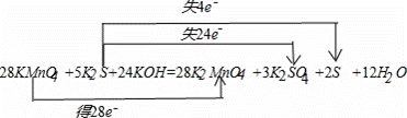 28KMnO4+5K2S+24KOH=28K2MnO4+3K2SO4+2S↓+12H2O 转移电子