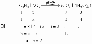 1L丙烷与xLO2混合点燃,丙烷完全反应后,生成混合气体体积为aL(气体体积均在120℃、1.01×105Pa时测定)。将aL混合气体通过足量碱石灰后,测得剩余气体体积为bL。若a-b=6,由x的值为