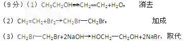 (9分)用乙醇制取乙二醇(HOCH2—CH2OH),需要经过3个阶段,依次写出反应的化学方程式,并注明反应类型: