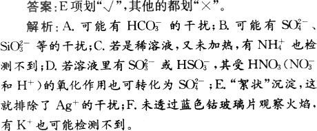 F.(  )用洁净的铂丝蘸取溶液在酒精灯的火焰上灼烧,未看见火焰显紫色,溶液里一定不含K+