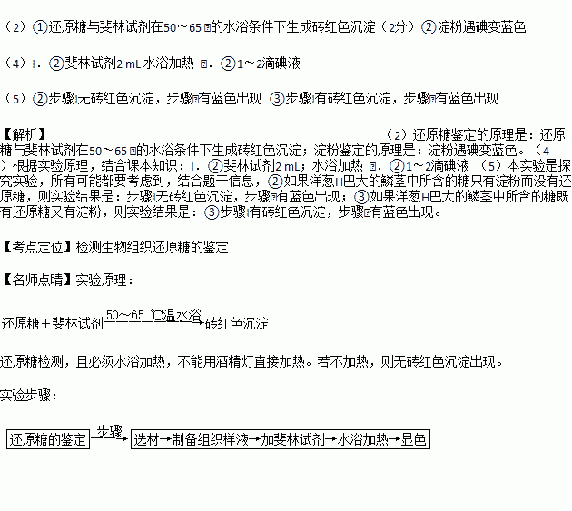 (1)实验目的:探究洋葱肥大的鱗茎中所含的糖是淀粉还是还原糖。