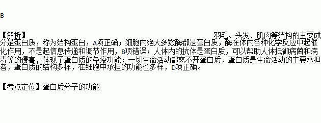 B. 有些蛋白质起信息传递作用,能够调节机体的生命活动,如体内的各种酶。