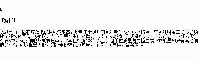 某些植物在早春开花时,花序细胞的耗氧速率高出其他细胞100倍以上,但单位质量葡萄糖生成ATP的量却只有其他细胞的40%,此时的花序细胞