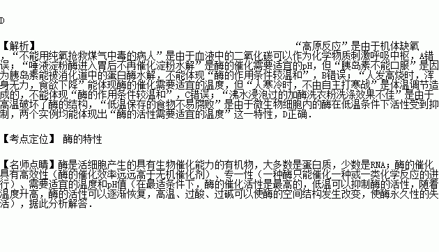 D.“沸水浸泡过的加酶洗衣粉洗涤效果不佳”和“低温保存的食物不易腐败”