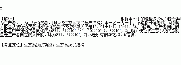 下图是对某生态系统的能量流动分析调查后的结果,甲~戊表示生态系统中的生物成分(戊是分解者)。GP表示总同化量,NP表示净积累量,R表示呼吸消耗量。箭头表示能量流动方向。据图分析下列正确的是(数值单位:105J·m-2·a-1)( )