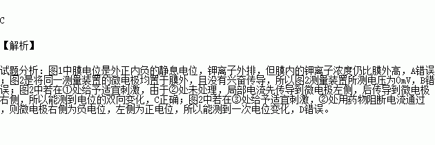 A.图1中膜内的钾离子浓度甲处比乙处低