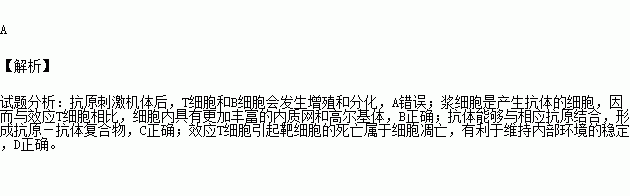 A.抗原刺激机体后,T细胞和B细胞会分化,但不会增殖