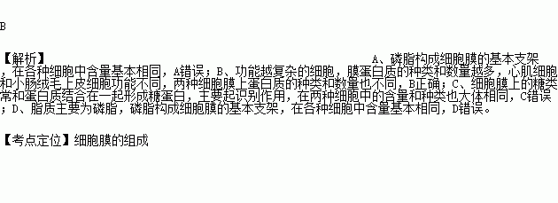心肌细胞和小肠绒毛上皮细胞在细胞膜上的不同主要体现在( )