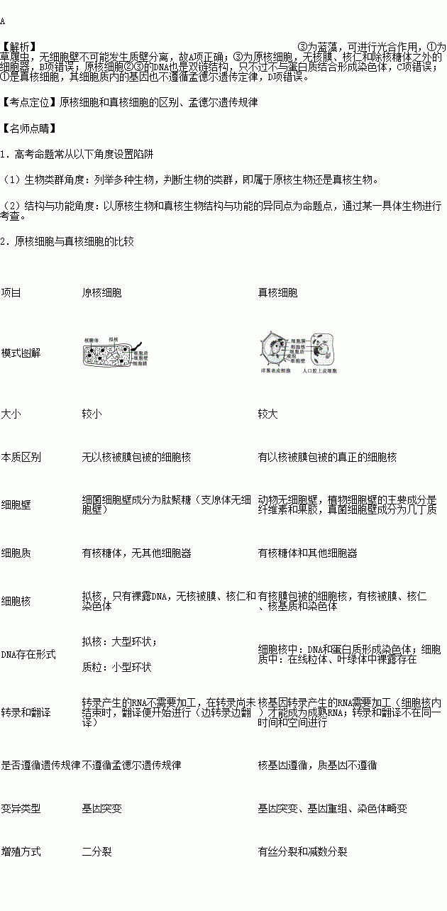 A.能进行光合作用的是③,①一定不能发生质壁分离