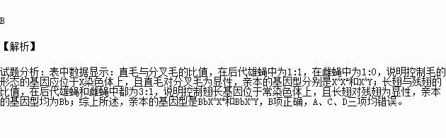 两个直毛长翅的雌、雄果蝇相互交配,后代表现型及比例如下表。设控制毛的形态的基因为A、a,控制翅长基因为B、b。亲本的基因型是