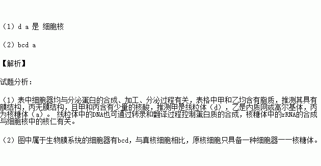 下图表示分泌蛋白的合成、加工、分泌过程,a、b、c、d表示细胞器,表格是其中三种细胞器的化学成分。请回答相关问题: