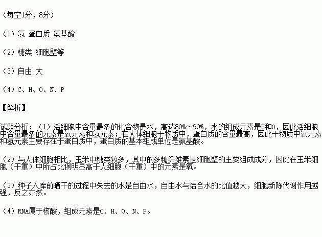 (2)由表中数据可以看出,在玉米细胞(干重)中所占比例明显高于人细胞(干重)中的元素是氧,发生这种差异的一个主要原因是组成玉米细胞的化合物中________成分较多,此类化合物可作为________结构的基本组成成分。