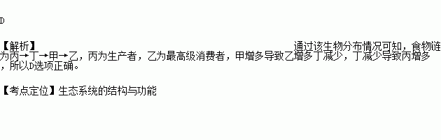 ,下图表示某一生态系统中四种生物所含有机物的总量。假设这四种生物只构成一条食物链。在一段时间内,如果甲的种群数量增加,其可能引起的后果是( )