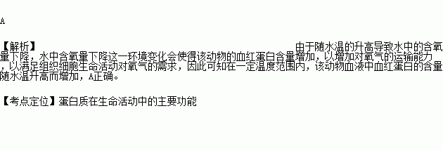 水中氧含量随水温的升高而下降。生活在寒温带湖泊中的某动物,其血液中的血红蛋白含量与其生活的水温有关。图中能正确表示一定温度范围内该动物血液中血红蛋白含量随水温变化趋势的曲线是