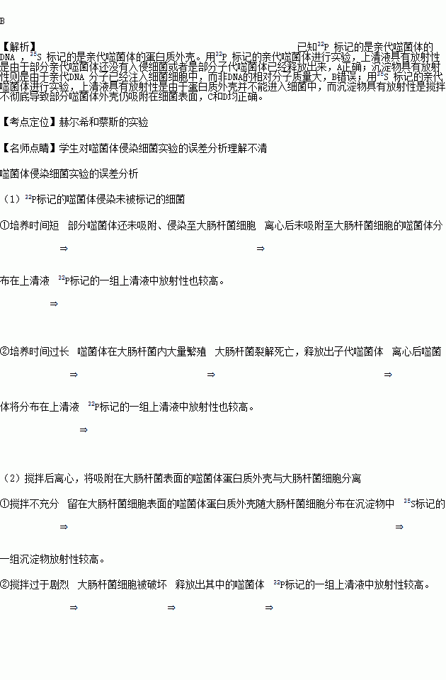有关赫尔希和蔡斯证明遗传物质是DNA的实验中,导致离心后的上清液或沉淀物中出现放射性的叙述错误的是
